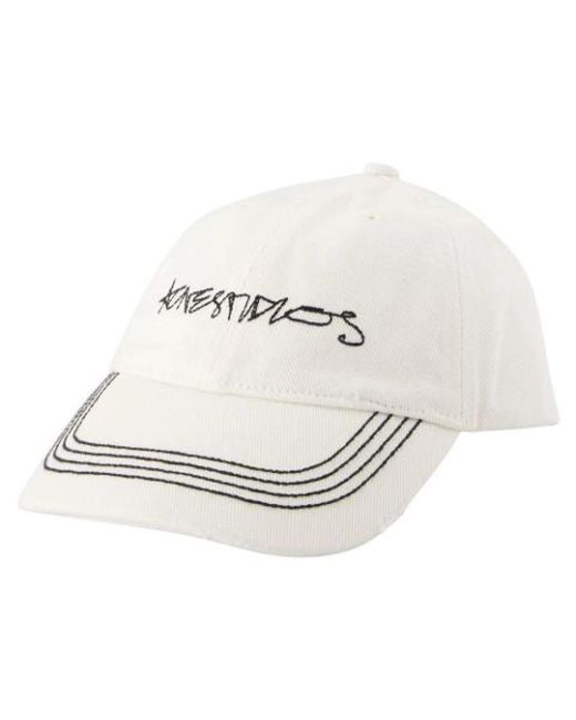 Acne Studios Logo Cap is a cotton twill baseball cap with a raised embroidered logo and classic curved brim. This item is new with original hangtags attached; a photo of the tag is available. Key attributes: White | Cotton | Twill construction | Ventilated crown (embroidered eyelets) | Adjustable D-ring closure at back | Partially lined | Six-panel construction | Curved brim | Embroidered logo | Embroidered eyelets at crown | Dimensions & fit: 59 cm | One size | Composition & care: Shell: 100% cotton | Lining: 100% cotton | Follow manufacturer care instructions. Colour: metallic
