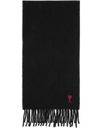 Go to Ami ParisProduct from a brand featuring a red heart logo with the letter A. Fringed classic scarf in wool. Black Ami de Coeur satin stitch embroidery Size without the fringes: 25 x 190 cm Length of