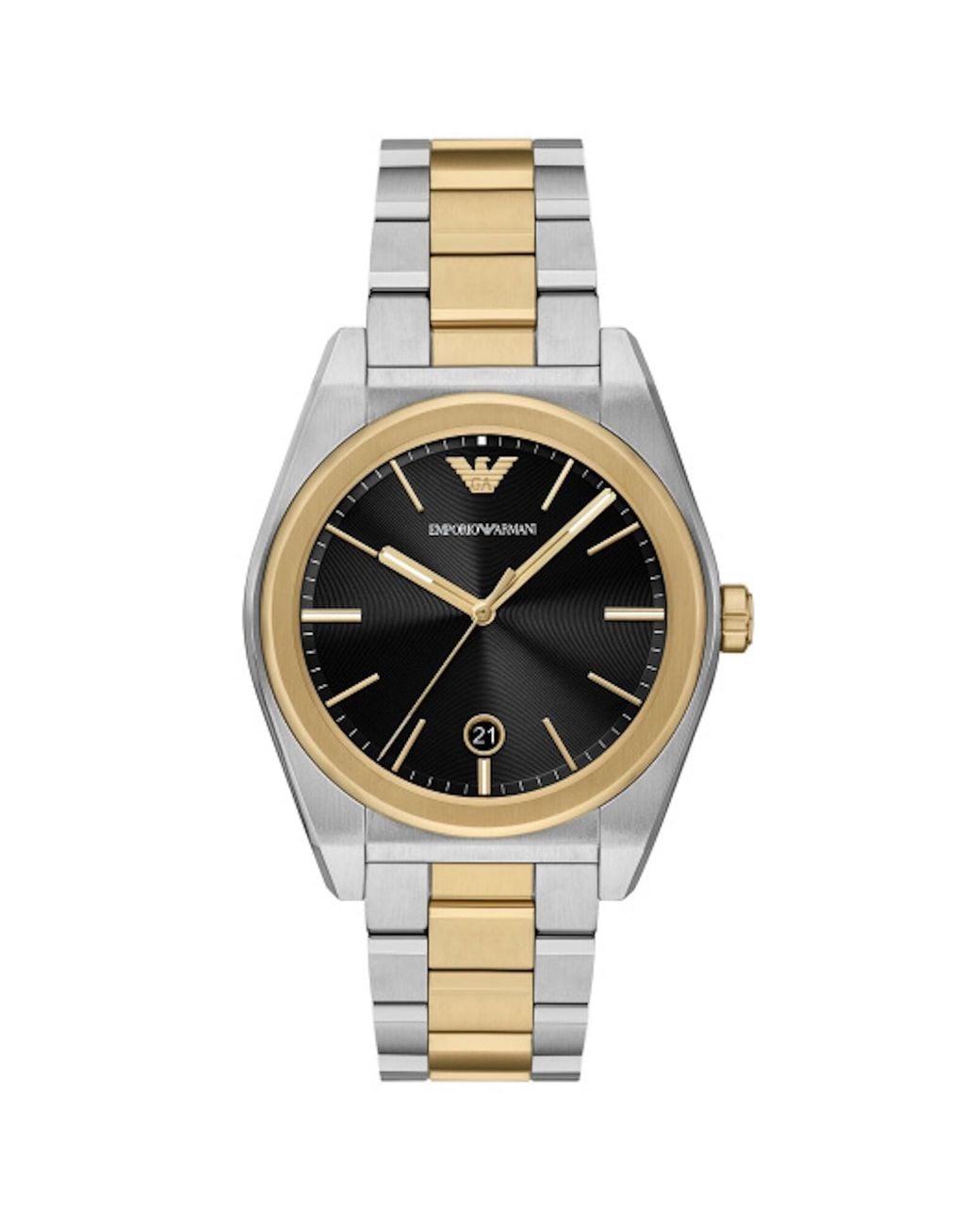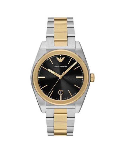 Emporio Armani AR11175 Watch In Black A chronograph movement watch with a 41mm gold stainless steel case. A black dial on the round face with gold and silver stainless steel batons. A gold and silver stainless steel strap with a push button deployment clasp. The signature Emporio Armani logo is situated at 12 O Clock. Water resistant 50 metres. Complete with an official Emporio Armani display case. Colour: metallic