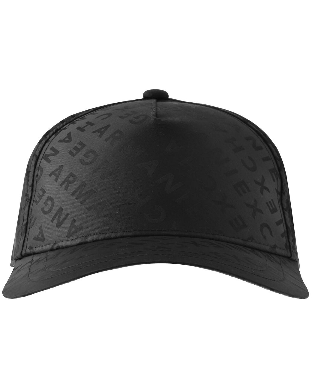 Armani Exchange Logo Baseball Cap In Black. A classic baseball cap design with a stiff hard front peak and stiff front panel. Armani Exchange logo is repeated all over in a tonal design Adjustable strap with velcro fastening. Embroidered eyelets are featured on 4 panels for ventilation. 100% Polyamide Lining: 100% Cotton Colour: black