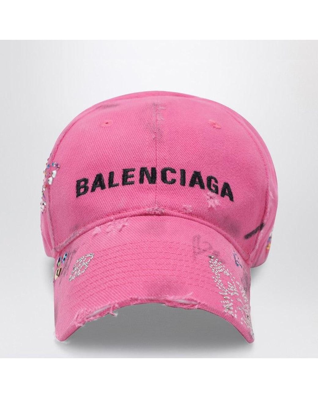 Balenciaga pink cotton baseball cap featuring embroidered ventilation eyelets on the top, adjustable strap with hook-and-loop closure at the back, upcycled details on the front, distressed and dirty effect, embroidered logo on the front, rhinestones and all-over scribbles.SpecificationValueBrandBalenciagaAge GroupadultColorPinkMaterialCottonMade InChinaGenderWomenSizeMSeasonSS26
