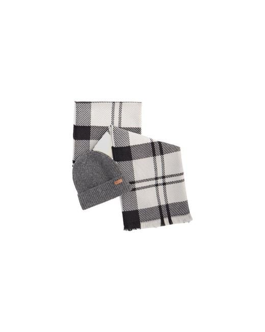 The Barbour Pendle Beanie & Blair Scarf set is the perfect choice for facing the cold season with style and comfort. This box includes a knitted beanie with a turned-up brim and an elegant checked scarf, combining practicality and sophistication typical of the Barbour brand. Made from a blend of 97% polyester and 3% elastane/lycra, the set ensures softness, stretch, and a comfortable fit. The beanie features a side Barbour label, while the scarf stands out with its fringed ends and timeless design. Ideal as a gift or to complete your winter wardrobe, this set easily matches various looks, from city outfits to outdoor walks. Season: FW25. Colour: grey