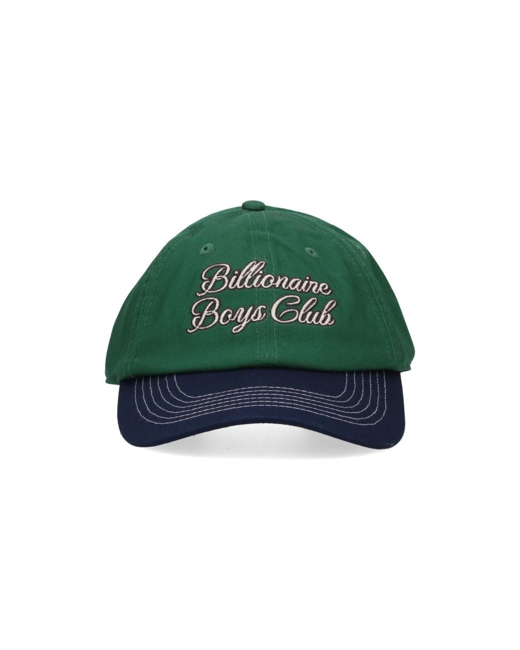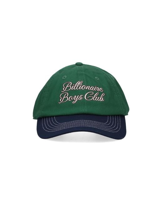 Six-panel baseball cap in green twill fabric with a contrasting navy brim featuring visible contrast topstitching. Front panel displays embroidered Billionaire Boys Club text in a cursive script with beigepink tonal thread. The rear features a green adjustable strap with a silver-tone metal slide buckle embossed with the brands astronaut helmet logo. Colour: green