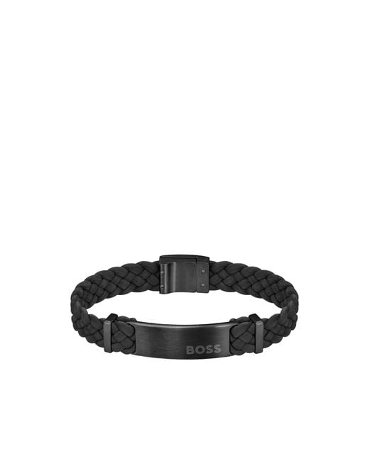 An elevated braided cuff, with a black steel logo plate, by BOSS Jewelry. This accessory comes in soft black suede for a refined feel. Wrist circumference: 19cmSize: M