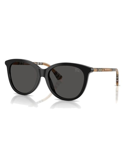 Here are the new Burberry BE4455 416187 sunglasses. Acetate frame in glossy black colour with a Phantos shape on dark grey lenses. Iconic Haymarket Check pattern of the brand present on the temples. Colour: black