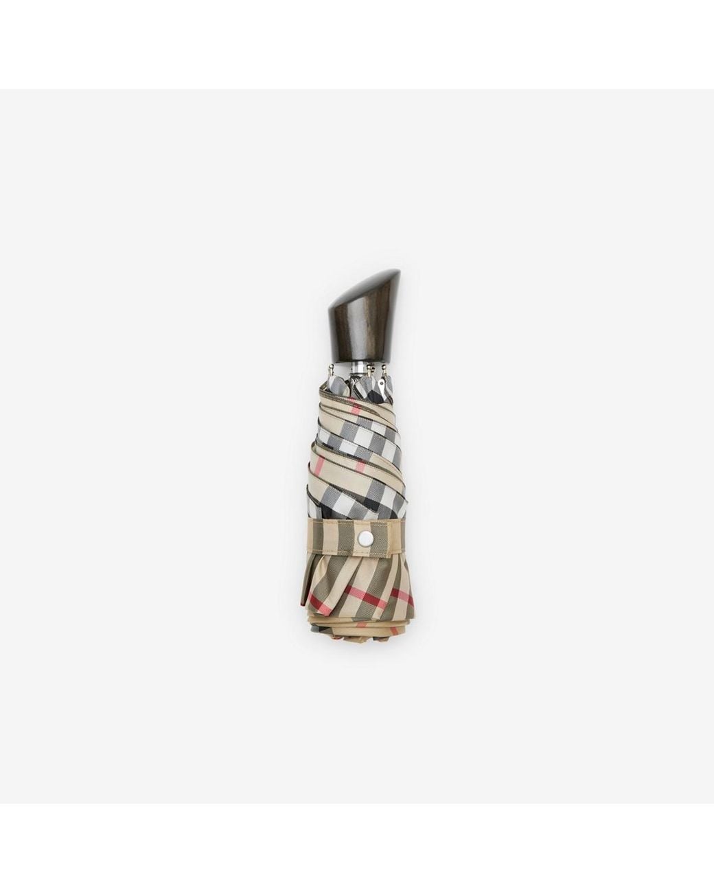 A folding umbrella woven with the Burberry Check. The compact style is finished with a smooth wooden handle and metal cap engraved with our Equestrian Knight Design. Press-stud closure Comes with coordinating zip pouch