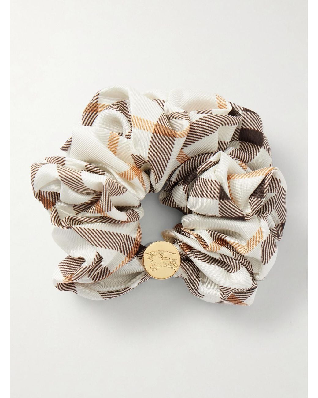 Women's Natural Embellished Checked Silk-Twill Scrunchie