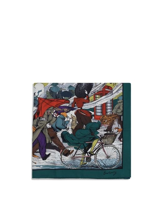 The raining cats and dogs silk scarf by burberry playfully celebrates the charm of unpredictable english weather. crafted in italy from silk twill, it features a hand-drawn archival-inspired illustration depicting londoners battling wind and rain in iconic coats and accessories. its square shape, hand-rolled edges, and burberry lettering along the borders elevate this refined and storytelling accessory. Composition: 100% % Silk