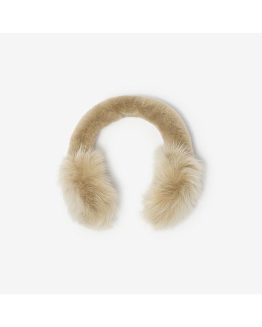 A pair of padded earmuffs made in Italy from soft shearling. The inner ears are lined with Burberry Check cashmere. Outer: 100% real farmed dyed lamb shearling, ovis aries, country of origin: Spain Lining: 100% cashmere Filling: 100% polyurethane foam Made in Italy Colour: metallic