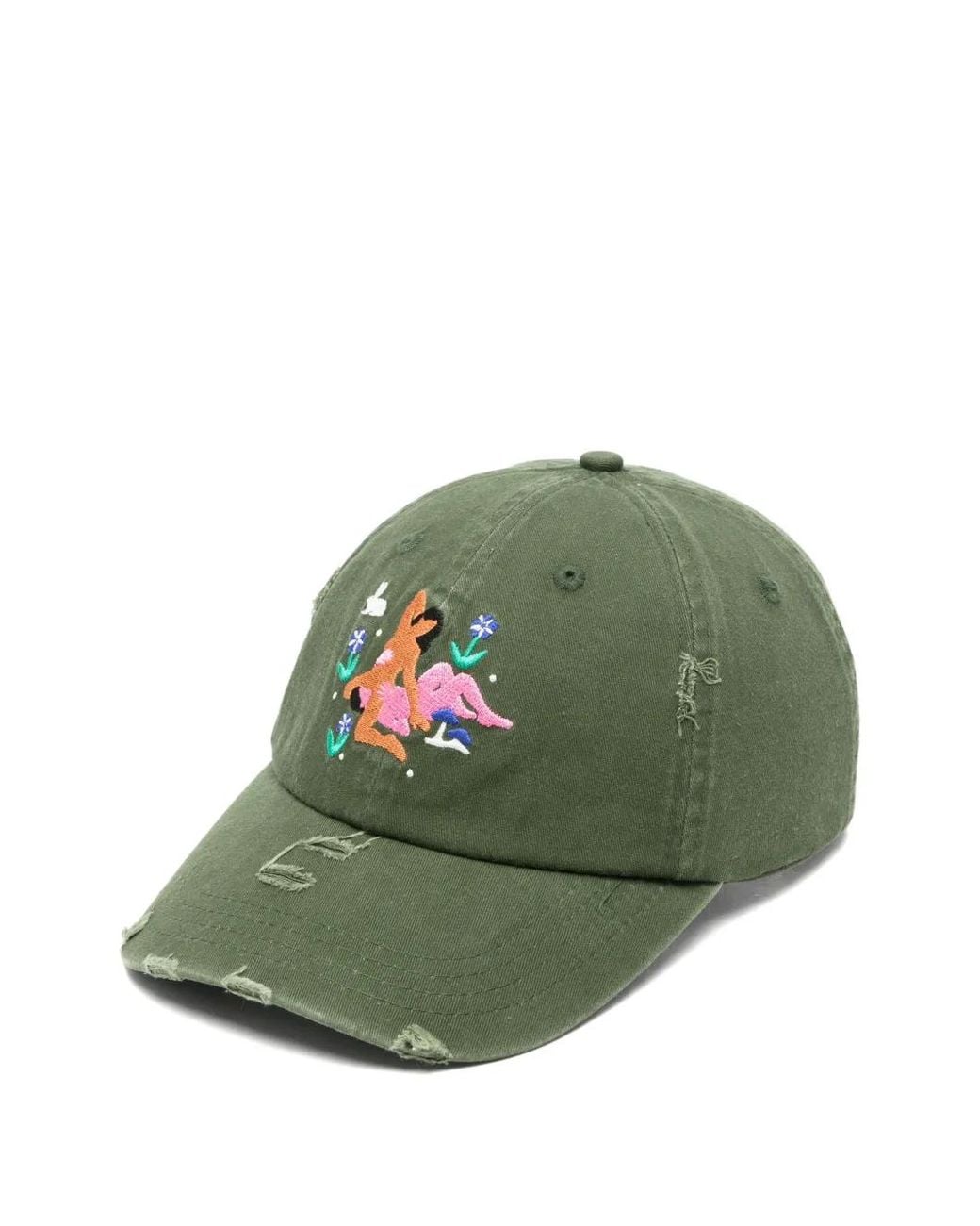 Green distressed effect graphic embroidery six-panel construction curved peak eyelet vents adjustable strap silver-tone hardware Size: One Size. Gender: Unisex. Material:Cotton/Polyurethane. Colour: green