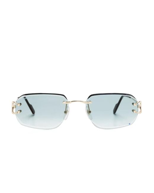 Gold-tone/blue metal rectangle frame rimless lenses gradient blue tinted lenses nose pads logo plaque at the tips sculpted arms with curved tips These glasses come with a protective case. Size: 58. Gender: Unisex. Material:Metal. Colour: blue