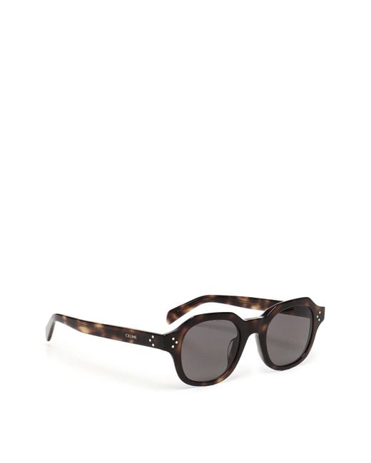 Geometric-frame sunglasses in tortoiseshell acetate with grey tinted lenses. The thick frame features softened angular edges, three small silver-tone stud details at the front corners of each lens, and slim temples with CELINE lettering printed on the inner side. Temple tips are in matching tortoiseshell acetate. Colour: multicolour