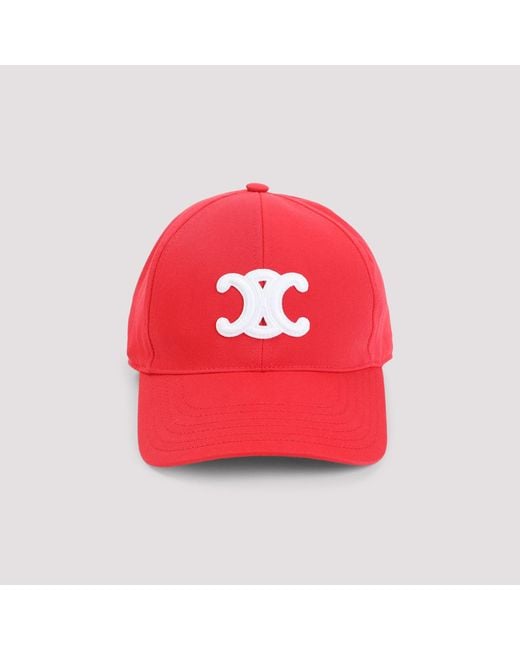 Celine Bright red Cotton Triomphe Baseball Hat. Crafted in cotton and polyester blend. Six-panel construction, front contrasting white patch logo, tonal visor, back adjustable strap, tonal stitching.
