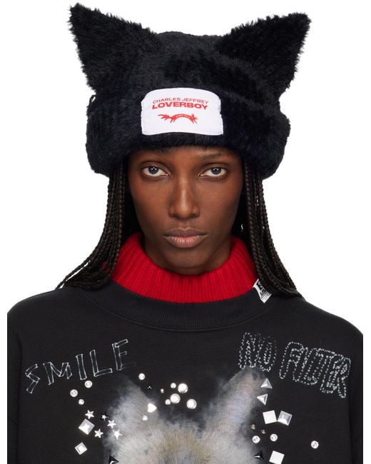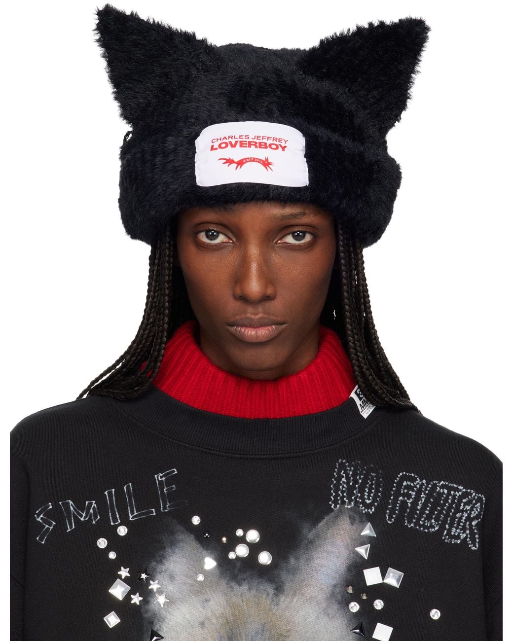 Rib-knit faux fur beanie. · Exposed seams with loose threads throughout · Ear appliqués at crown · Logo patch at rolled brim · Concealed logo hardware at back face Supplier color: Black Colour: black