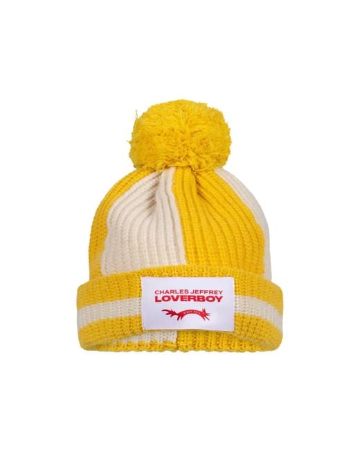 Ribbed knit fabric with striped details, pom-pom on the crown, rolled brim, logo patch, and logo hardware on the back. Colour: yellow