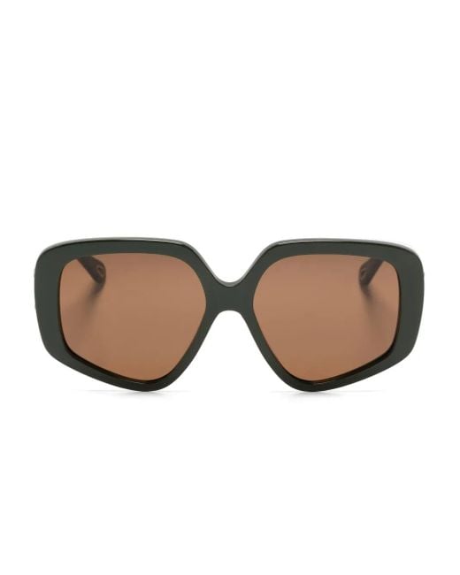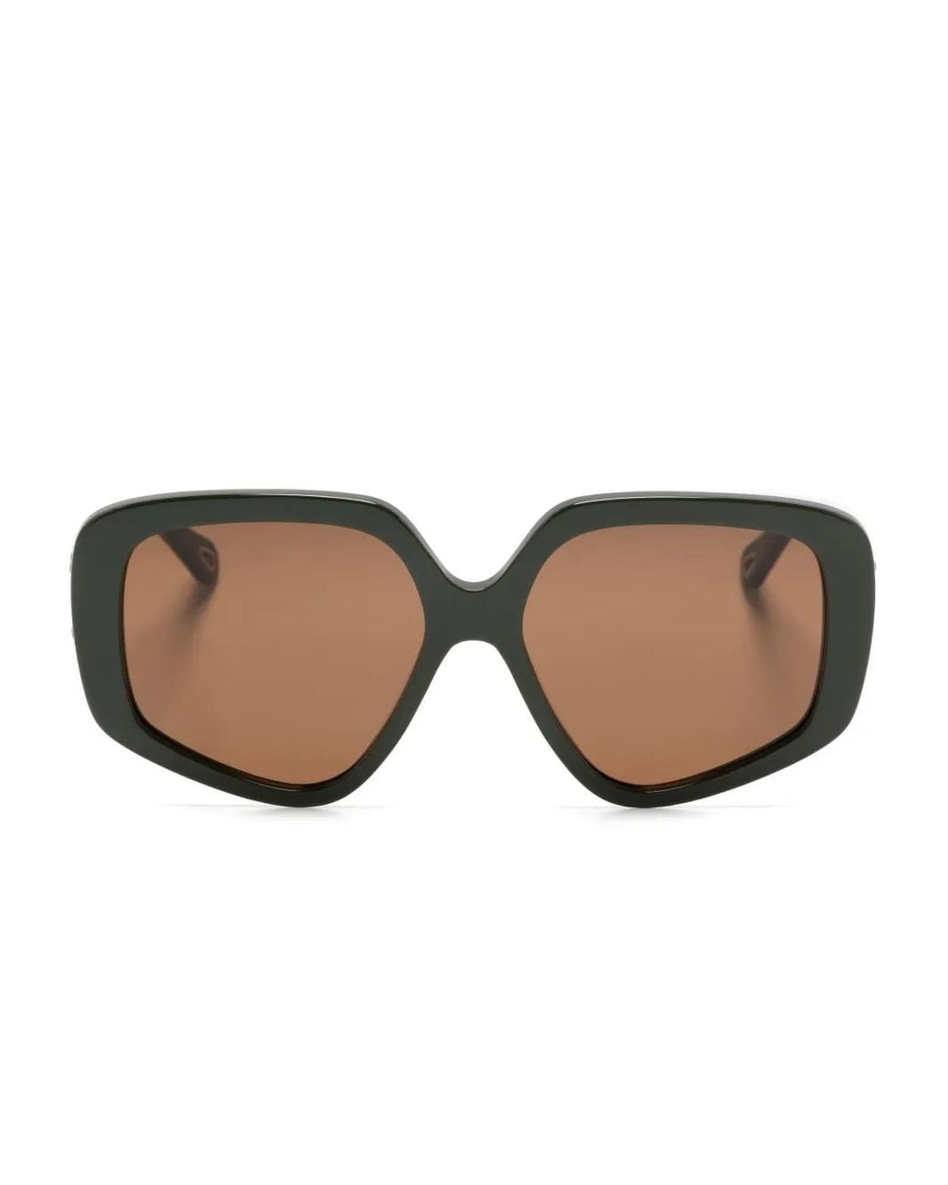 Dark green acetate oversize frame brown tinted lenses UV protection gold-tone logo lettering whipstitch detailing straight arms curved tips These glasses come with a protective case. Size: 56. Gender: Female. Material:Acetate. Colour: green