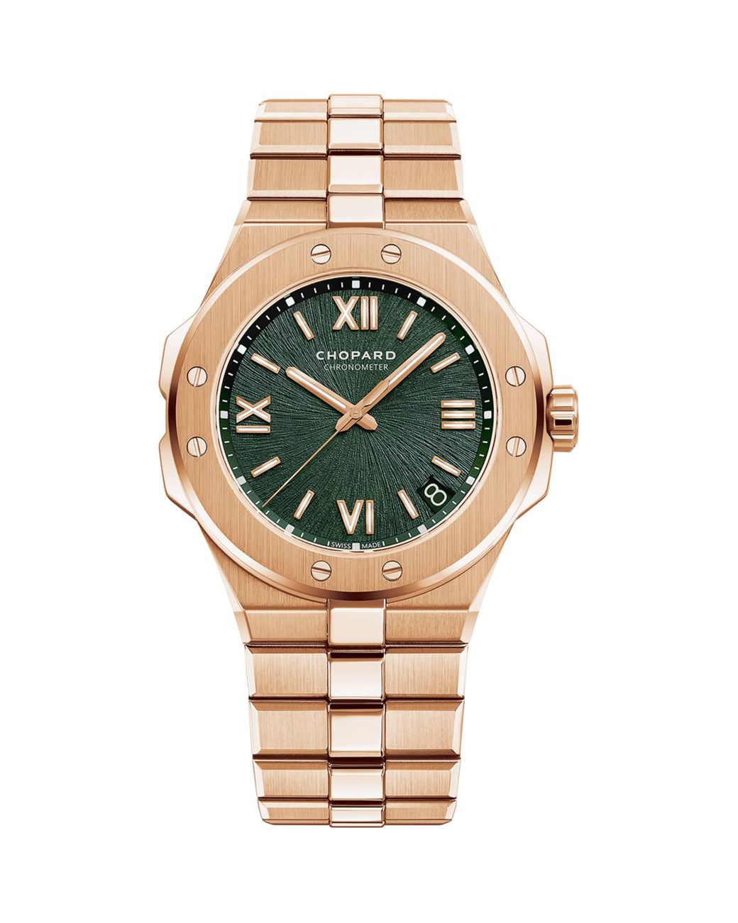 Designed by Chopard’s co-president Karl-Friedrich Scheufele, the Alpine Eagle watch collection is inspired by his passion for the Alps as well as the power of the eagle. Imagined in 18-karat rose gold, the piece is entirely crafted in the brand’s watchmaking workshop, ensuring utmost quality and precision. Boasting a clear sapphire crystal dial with gold-plated Roman numerals and hour markers, it is a timeless design for the modern aesthete. Colour: metallic
