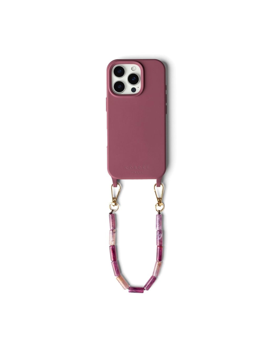 This must-have set features a 30cm phone wristlet chain with marbled stone beads, playful knot designs, and chic gold hardware. Plus, it comes with a matching shock-proof MagSafe silicone phone case with a soft interior lining. INCLUDES: Silicone Phone Case Burgundy; MagSafe Julia Phone Wristlet FEATURES: MagSafe-compatible phone case Shock-absorbent Length of 30cm for comfrotable crossbody wear Gold hardware Marbled burgundy shades Knot detailing Available as crossbody length (120cm), or wristlet length (30cm) phone case: 100% silicone. wipe clean phone wristlet: 100% faux pearls. wipe clean Colour: purple