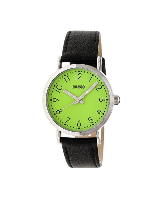 Polished Metal Case; Accurate Japanese Quartz Movement; Non-Glare Scratch-Resistant Mineral Crystal; Logo-Engraved Stainless Steel Caseback; Hinged Leatherette Strap; Logo-Engraved Stainless Steel Clasp; Luminous Hands; 36mm Diameter; 3 ATM Water Resistance; Colour: green