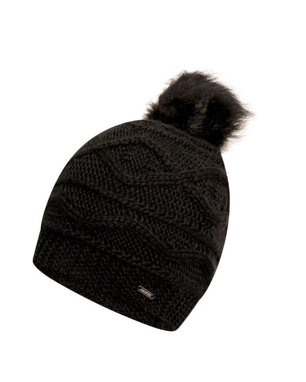 Material: Acrylic, Polyester. Fabric: Faux Fur, Knitted. Lining: Fleece. Design: Logo. Bobble, Ribbed Cuff. Sustainability: Made from Recycled Materials. Colour: black