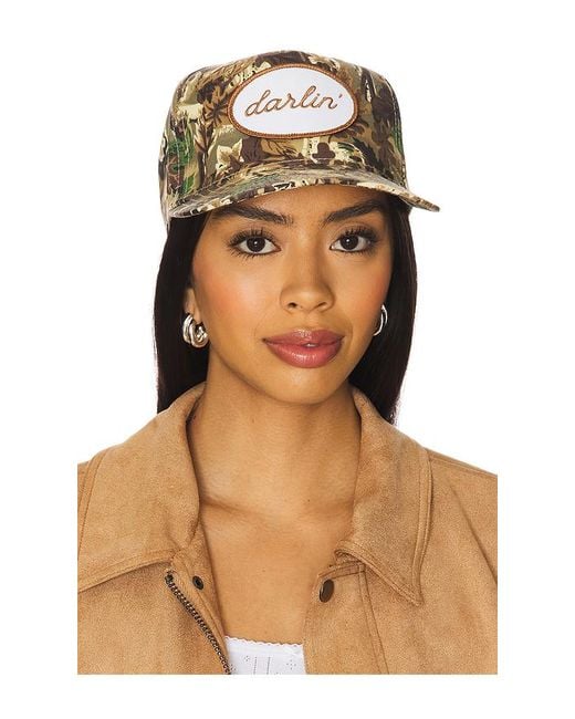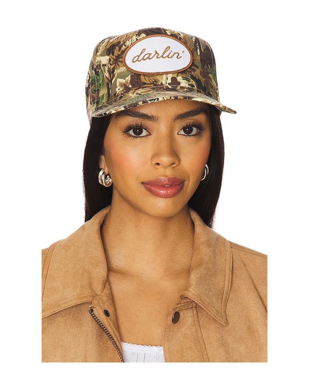 Darlin Patch Cap in Green. Darlin Patch Cap in Green. 65% polyester 35% cotton. Adjustable snapback closure. Front embroidered patch with slogan. Ventilating eyelets at top. Brim measures approx 2.75 in length OS measures approx 23 in circumference. DLIN-WA2. A013. Colour: natural
