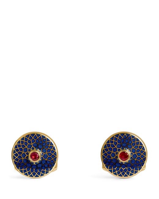 For centuries, men’s formalwear has remained virtually unchanged, with sober silhouettes and inky hues remaining commonplace. How then, can you add some glamour to a traditional look? The answer is with cufflinks; the miniature works of art that provide a decadent embellishment to tailoring. This pair by Deakin & Francis is crafted from 18-karat yellow gold and boasts a dazzling ruby centre and geometric pattern across the blue enamel. Colour: blue