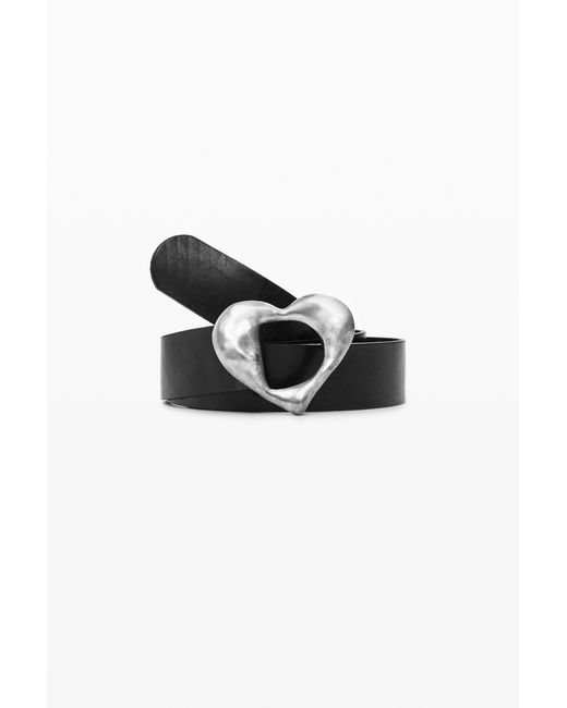 Plain leather belt with heart-shaped buckle. Wide design and adjustable length with tongue closure. Stiff material and rough surface. Fit: Regular. Material: 100% leather. Solid color: black. Closure: snap fastener with heart-shaped buckle. Wide design. Metal buckle. Colour: black