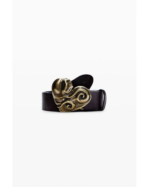 100% leather belt with a large heart-shaped buckle featuring an organic design. The strap is smooth and wide, with adjustable length and no visible seams. Fastening: Buckle. Material: 100% leather. Buckle: heart-shaped. Color: gold. Designed in Barcelona. Colour: black
