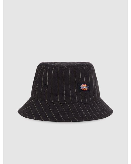 The Service Bucket hat is a warm-weather bucket hat constructed from hardwearing cotton denim. It has a classic all-around fit finished with an all-over hickory stripe and an iconic Dickies label on the front. A fresh summer hat with a retro feel. Colour: black