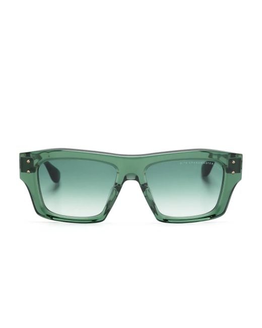 Dark green acetate transparent design logo plaque at the arm green tinted lenses square frame straight arms curved tips These glasses come with a protective case. Size: 54. Gender: Unisex. Material:Acetate/Titanium. Colour: green