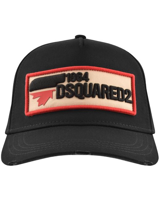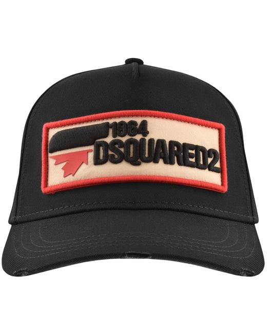 DSQUARED2 Patch Baseball Cap In Black. A five panel baseball style hat with a stiff front peak featuring intentional points of distress to the fabric. An adjustable woven strap fastening on the reverse with a branded silver buckle. A heavily embroidered DSQUARED2 logo patch is featured on the front of the cap with wording embroidered in red on the reverse above the strap. Embroidered eyelets are situated around the top for ventilation. 100% Cotton. Lining: 65% Polyester 35% Cotton. Colour: black