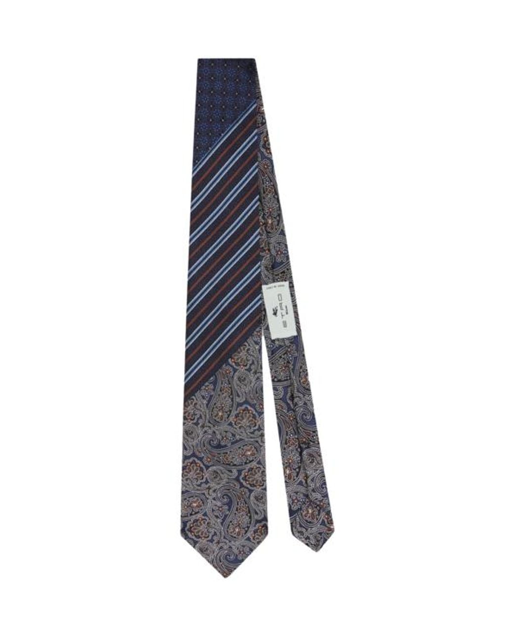 Pure silk jacquard tie with original patchwork effect sporting a geometric floral motif, slanted striped pattern and floral Paisley motif. Width: 3.1 inches (8 cm) Made in Italy Colour: blue