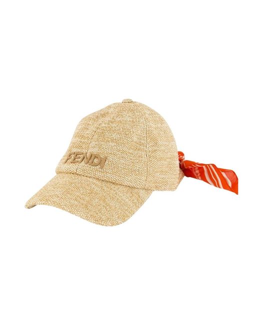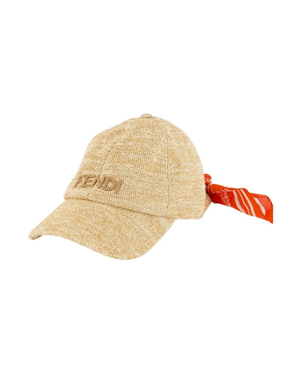 Fendi Beige Raffia Cap with Coral Foulard is a refined baseball-style cap that pairs a natural beige raffia body with a feminine coral cotton foulard at the back. The design highlights a semi-stiff peak and an embroidered logo for a polished, elevated look. Key attributes: Beige | Red | Viscose raffia | Semi-stiff peak | Embroidered logo on front | Cotton foulard in Coral Bandana print at back | Red and white floral, coral and FF motif | Dimensions & fit: Size S/M | Composition & care: 100% Polyamide | 100% Cotton | Lining: 100% Cotton | Wipe with a soft cloth. Colour: natural