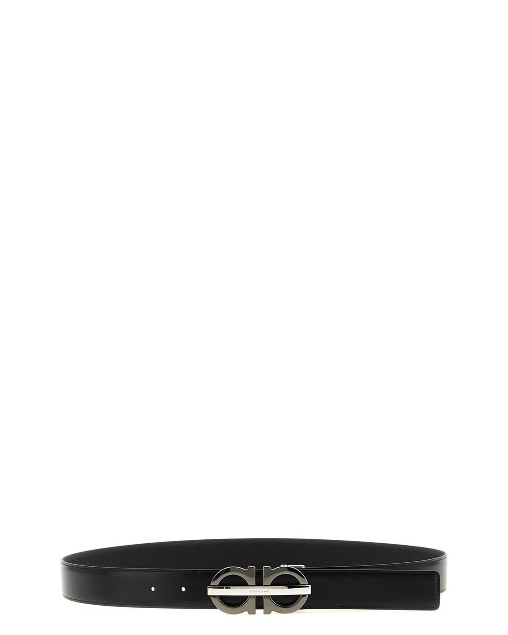 Reversible belt in smooth and hammered calf leather with double metal 'Gancini' buckle. Side A: smooth leather Side B: hammered leather Composition: 100% calfskin leather (Bos Taurus). Size&Fit: H 3.2 cm. Colour: black