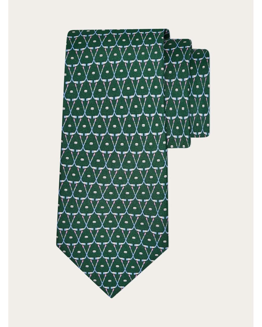 Sports are a longtime favorite in Ferragamo’s silk artistry, and this tie is no exception, featuring a crisp, geometric pattern of hockey sticks and pucks. Colourful and unexpectedly refined in its craftsmanship, it’s the perfect way to add a light, playful touch to formal looks. 100% silk Width at the bottom: 8 cm Colour: green