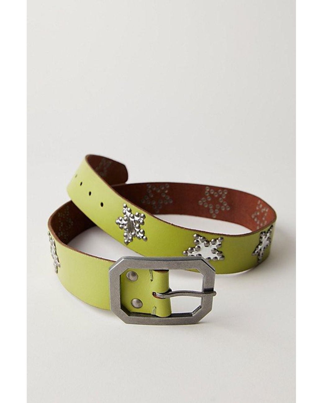 Add necessary embellishment to any look with this soft leather belt, featured in a medium width with studded stars and a classic buckle closure. **Features:** Soft leather fabrication, pointed tip, studded star detail, metal buckle with distressed finish **Why We ❤ It:** This star-studded belt can be worn to cinch your waist or to adorn your favorite pair of jeans. Starcrossed Studded Belt at Free People in Limelight, Size: XS/S Colour: multicolour