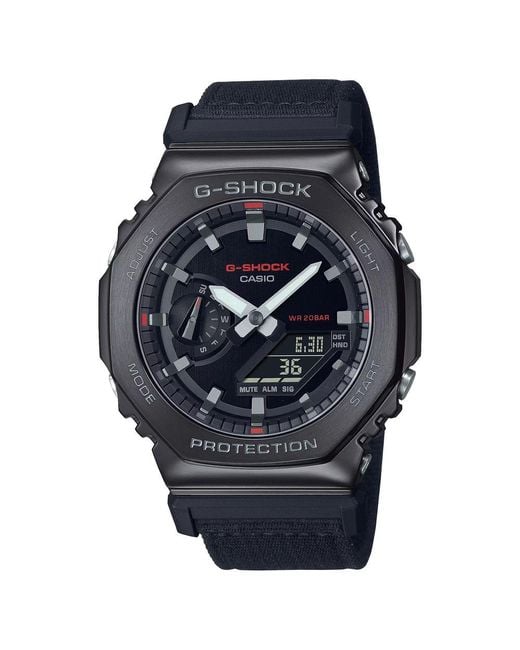 Type of mechanism: QUARTZ.Display: ANALOG/DIGITAL.Material Of Case: STAINLESS STEEL.Colour Of Case: BLACK.Material Of Bracelet: FABRIC.Colour Of Bracelet: BLACK.Dial Colour:BLACK.Glass type: MINERAL.Clousure: BUCKLE.Water resistence: 20ATM.Diameter dial: 49,3MM.Special Functions:G-SHOCK LED LIGHT WORLD TIME STOPWATCH TIMER ALARM.