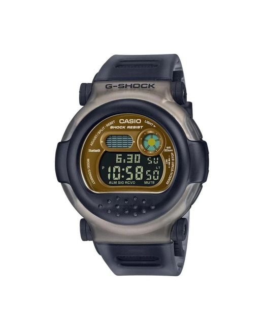 The Grey Resin Watch by Casio G-Shock is a robust and stylish timepiece designed for men. It features a quartz mechanism and a digital display encased in durable grey resin. The matching grey resin bracelet and golden dial add a touch of sophistication. Equipped with a mineral glass dial and buckle closure, this watch is built for both fashion and function. It boasts a water resistance of 20Atm and a 47mm diameter dial. Special functions include smartphone compatibility, visibility in the dark, a stopwatch, and an alarm. Colour: grey