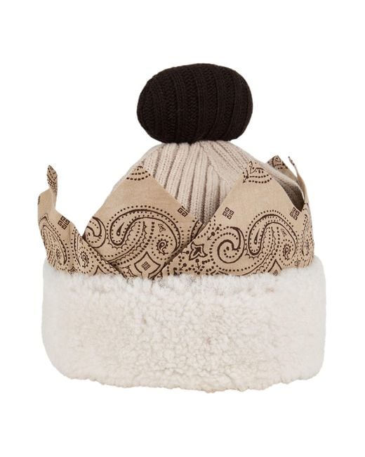 GIVENCHY. beanie , knitted, shearling, mid-weight knit, paisley-print, no appliqués, do not dry clean, do not bleach, do not tumble dry, do not iron. 70% Wool, 30% Cashmere, Lambswool. Colour: natural