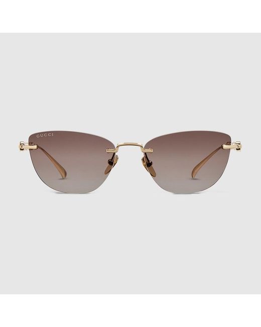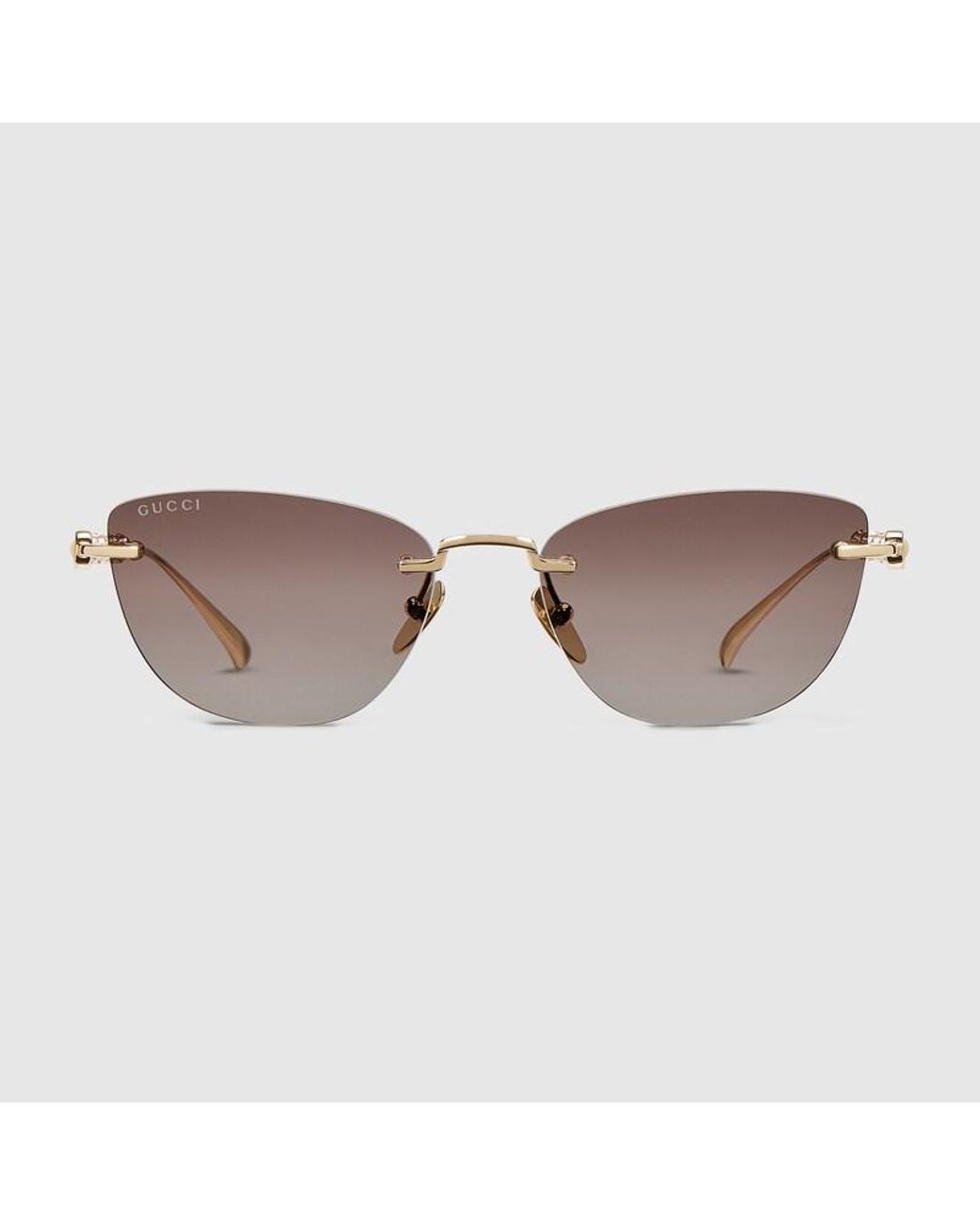 The House's eyewear collection continues to reinterpret emblematic motifs, from the GG, Web, bamboo, Horsebit and equestrian inspirations, in sumptuous materials, intricate craftsmanship, and fresh hues. These cat-eye sunglasses are presented in gold-toned metal with crystal-set, cylindrical temples. Gold-toned metal frame, Gold-toned metal crystal-set, cylindrical temples with engraved logo on endtips, Gradient brown lens, 100% UVA/UVB protection, GG2063S, Temple length: 14.5cm, Lens height: 4c Colour: brown