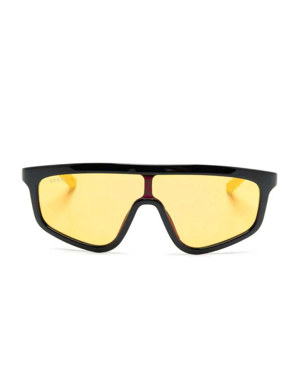 Black/lemon yellow acetate high-shine finish signature GG Supreme lenses shield frame yellow tinted lenses UV-protective lenses lens decal nose pads straight arms curved tips These glasses come with a protective case. Size: One Size. Gender: Unisex. Material:Acetate.