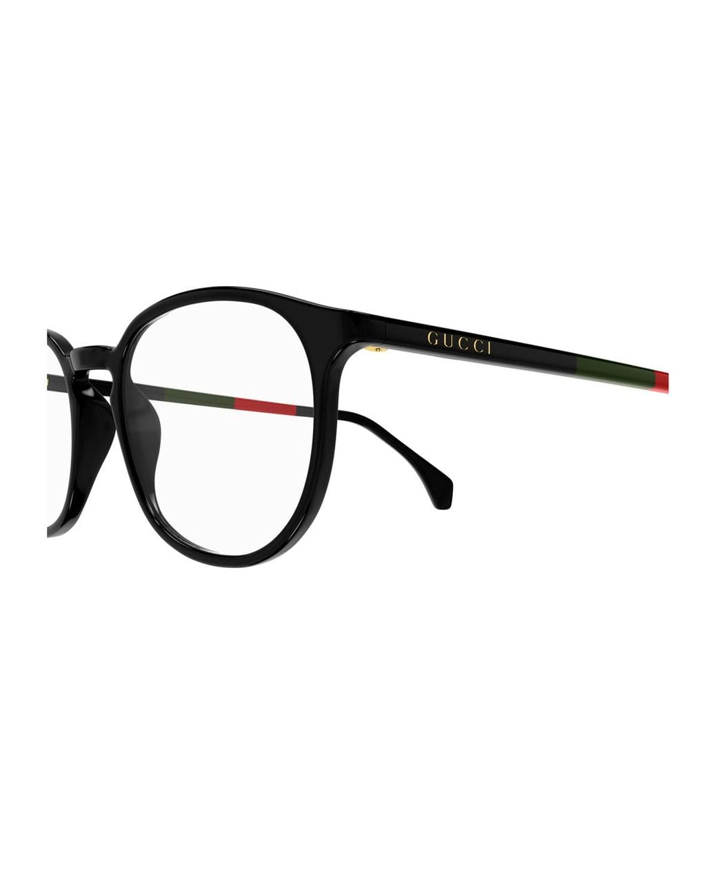 The new GG0551O optical model enriches Guccis Institutional Logo line with an essential and contemporary aesthetic elegantly interpreting the concept of minimalism. The frame crafted from ultra-thin glossy black acetate stands out for its soft round shape with a keyhole bridge bringing balance and refinement to the design. The slender temples enhanced with inserts in the iconic green and red colors are completed by the Gucci logo a distinctive detail that signs the model with discretion and style.