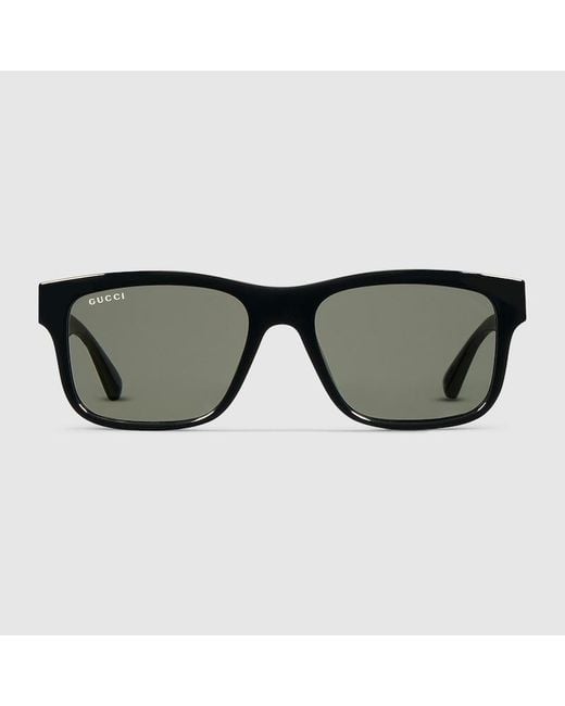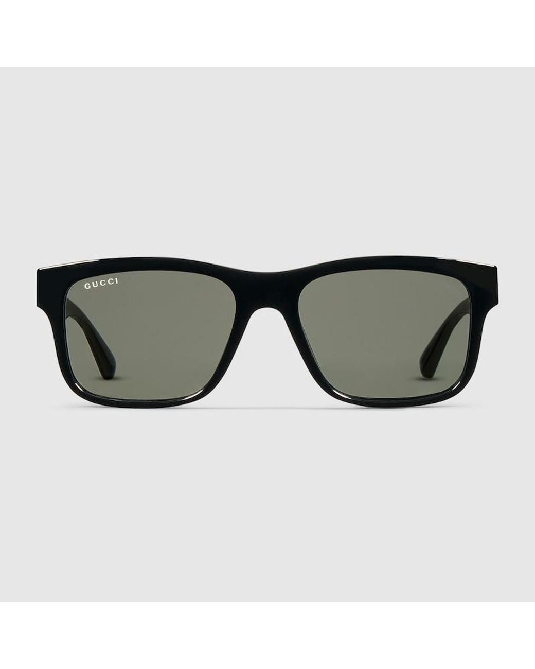 The House's eyewear collection continues to reinterpret emblematic motifs, from the GG, Web, bamboo, Horsebit and equestrian inspirations, in sumptuous materials, intricate craftsmanship, and fresh hues. Presented in shiny black acetate, these rectangular sunglasses are defined by an enamelled Web and metal plaque near the hinge. Shiny black acetate frame, Shiny black acetate temples with enamelled Web and metal plaque near the hinge, Solid grey lens, 100% UVA/UVB protection, GG2085S , Temple leng Colour: black