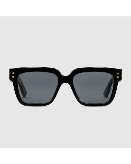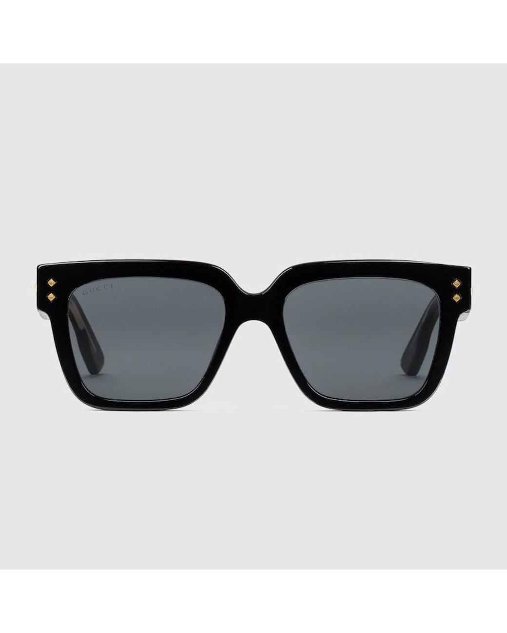 These rectangular-frame sunglasses have a timeless appeal. Crafted from black acetate, they are characterised by subtle gold-tone Gucci lettering and rivets detailing on the frame and temples. A grey lens completes the style with a contemporary feel. , Shiny black acetate frame with Gucci rivets, Shiny black acetate temples with Gucci logo detail and rivets, Solid grey lens, 100% UVA/UVB protection, Frame height: 5.15cm, Frame Width: 14.6cm, GG1084S , Temple length: 145mm, Lens height: 42.7mm, N Colour: black