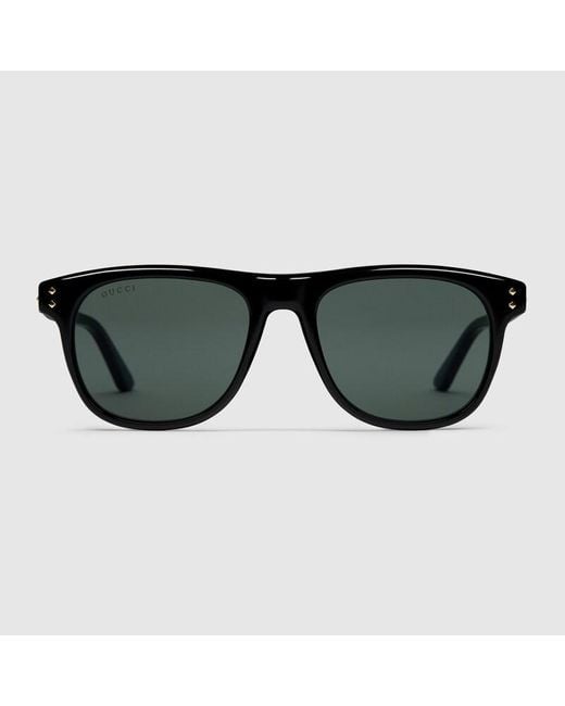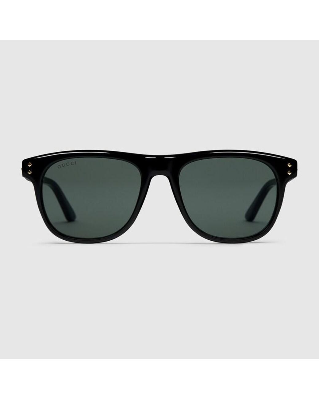 The Cruise 2025 eyewear collection blends a sleek silhouette and very subtle motifs in a classic design. These square sunglasses feature small metal rivets on the frame and temples, with a Gucci logo. Shiny black acetate frame with metal rivets, Shiny black acetate temples with Gucci logo and metal rivets, Solid grey lens, 100% UVA/UVB protection, GG1893S, Temple length: 14.5cm, Lens height: 4cm, Nose bridge length: 2.1cm, Frame height: 4.5cm, Frame width: 14.5cm, Hinge to hinge: 13.3cm, Made in