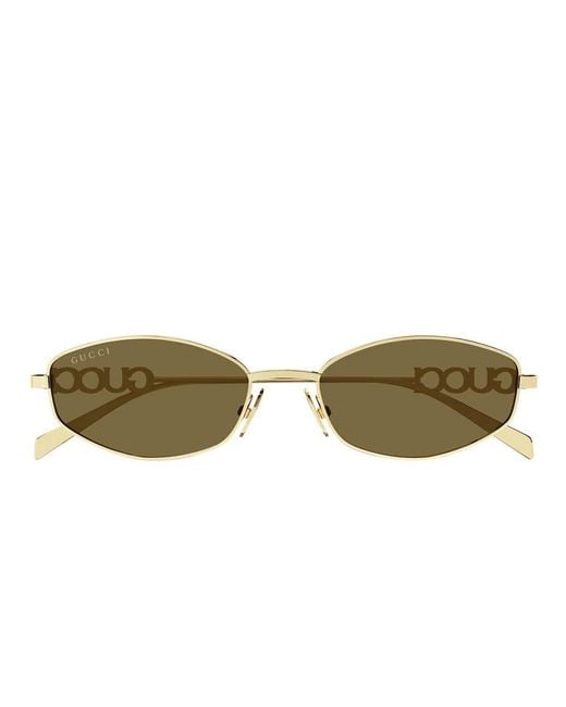 Gucci Gg 1802S Sunglasses combine a narrow almond silhouette with a metal frame for a refined, contemporary look. The three-dimensional Gucci logo on the temples and lens options add a distinctive, fashion-forward detail. Key attributes: Yellow | Oro | Metal | Narrow almond shape | Three-dimensional Gucci logo on temples | Lens available in Guccissima pattern or solid tint | Metal frame Colour: green