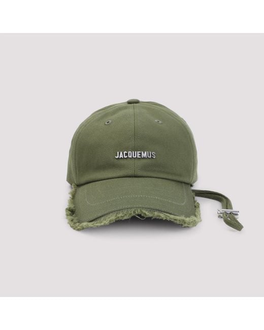 Jacquemus Green La Chasquette Artichaut. Green cotton, 6-panel contruction, Weather-resistant. Topstitched brim with fringed edges. Silver metal logo, adjustable strap with a metal stopper. Size: 56, 58, 60, 62