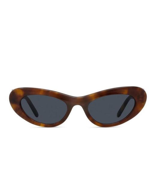 Loewe Lw 40156U Sunglasses combine a slim cat-eye silhouette with refined acetate construction and a distinctive barcode-effect logo on the temples for a contemporary, polished look. Key attributes: Brown | Havana | Acetate | Comfortable | Lightweight | Prescription-lens compatible | Lightweight construction for all-day comfort | Cat-eye silhouette | Slim family design | Full rim | Oval shape | Barcode-effect graphic logo on both temples | Gold-finish Loewe logo | Dimensions & fit: Lens width: 52 mm | Lens height: 33 mm | Bridge width: 20 mm | Temple length: 140 mm | Slim silhouette | Composition & care: Acetate (frame) | lens material Colour: blue