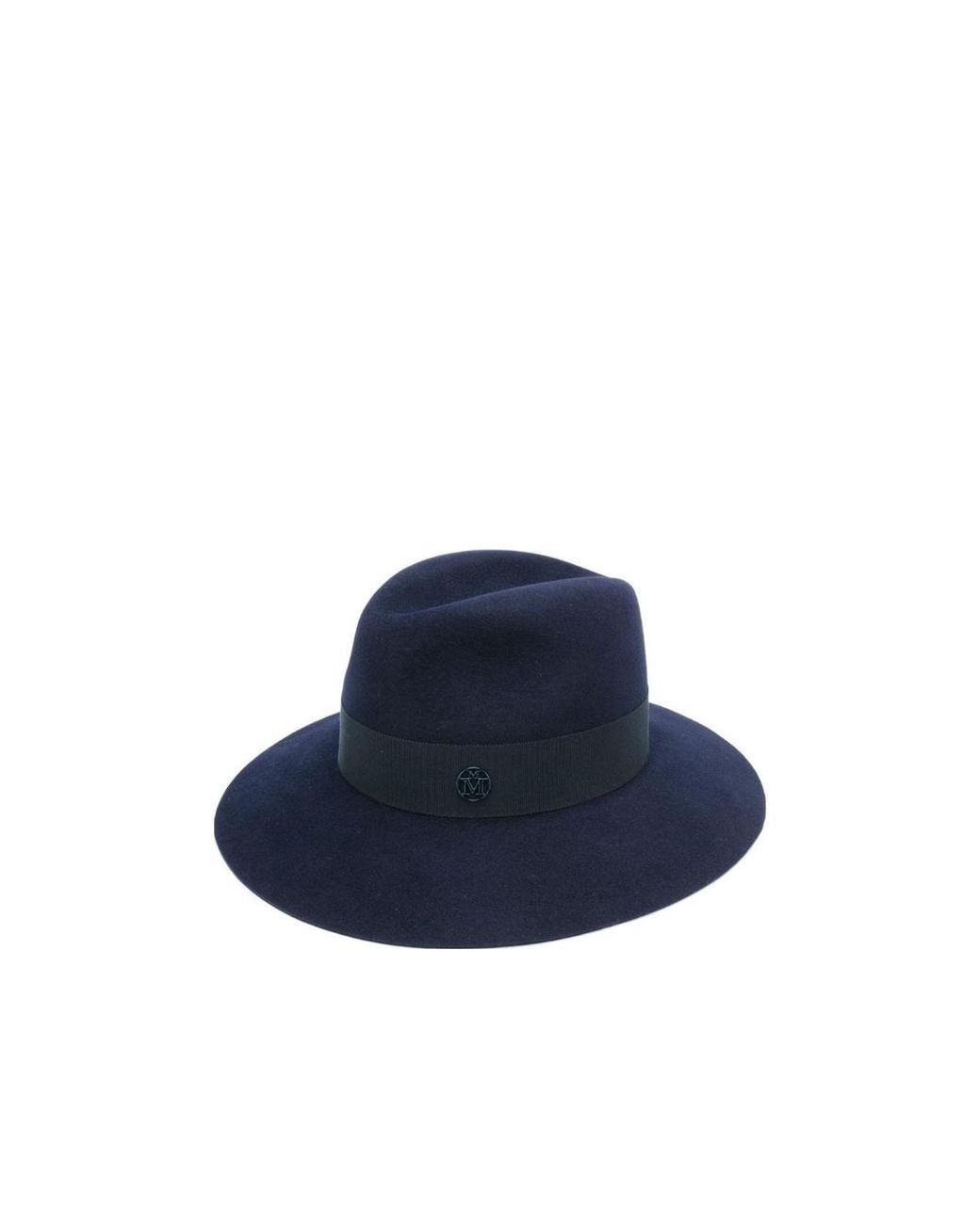 Navy blue emblem felt hat, decorated with brand logo, dome, broad brim. Colour: blue