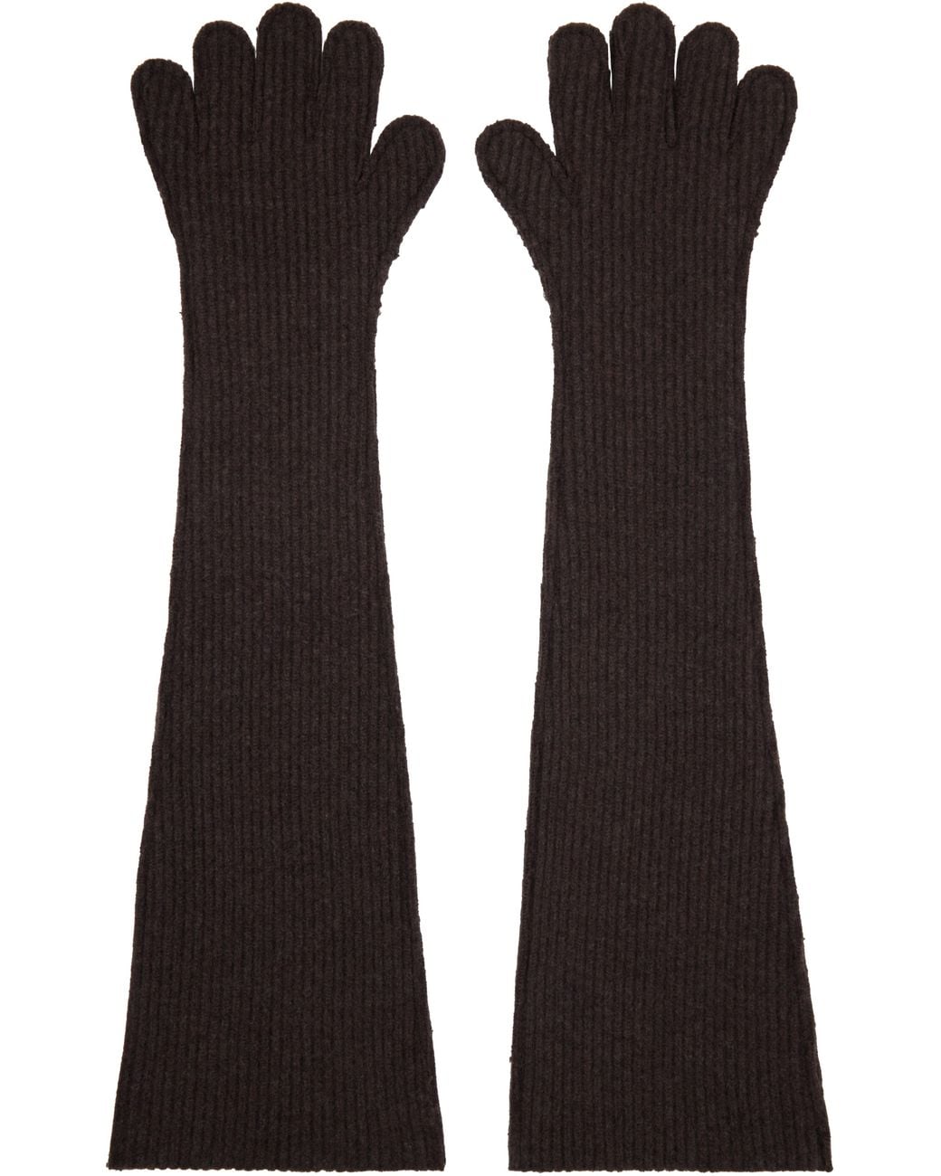 Rib-knit virgin wool gloves in brown. Pinched seams throughout. Supplier color: Chestnut Colour: black